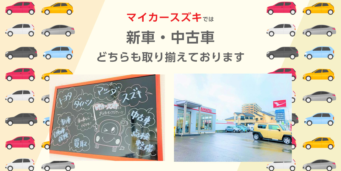 新車はダイハツ以外も取り扱っております。トヨタ ニッサン スズキ ホンダ スバル マツダ ミツビシと国内メーカーを取り扱っております。ダイハツ車以外も比べて見てみたいとの要望にもお応えしております。是非一度マイカースズキへの見学にお越しください。